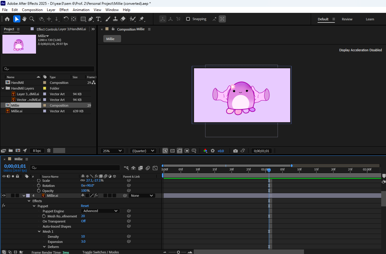 To get the animation looking right, I started by watching a few tutorials on YouTube about how to animate squishy movements in After Effects. But then I remembered that Rifah had spent her entire break mastering the software. I reached out and she ended up showing me how to use the Puppet Tool, which was a game-changer. It gave the characters way more flexibility and the exact kind of bounce and stretch I needed.
